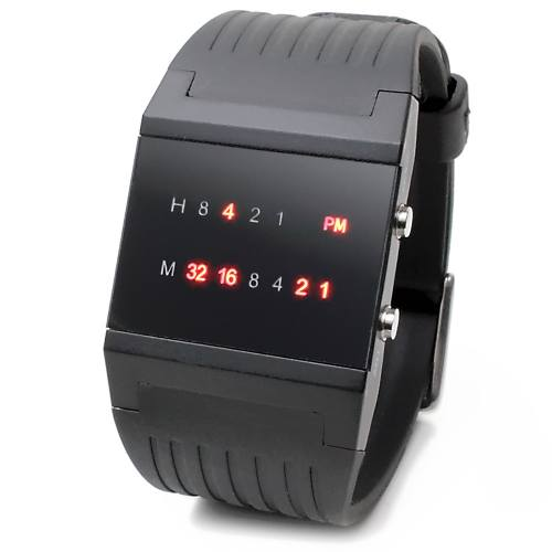 二进制手表顶部有 4 个 LED 代表 小时(0-11),底部的 6 个 LED 代表 分钟(0-59)。每个 LED 代表一个 0 或 1,最低位在右侧。