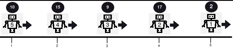 解释:在本例中不存在碰撞,因为所有机器人向同一方向移动。所以,从第一个机器人开始依序返回健康度,[2, 17, 9, 15, 10] 。