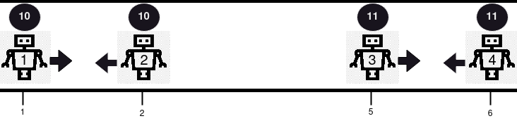 所有机器人以 相同速度 同时 沿给定方向在路线上移动。如果两个机器人移动到相同位置,则会发生 碰撞 。